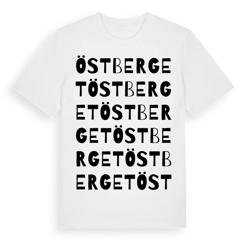 Östberget ordlek t-shirt är inspirerad av byn Östberget i Jämtlands län, Sverige. Tröjan är designad för dig som har en speciell koppling till platsen – oavsett om du bor här, har rötterna här eller bara älskar Östberget.