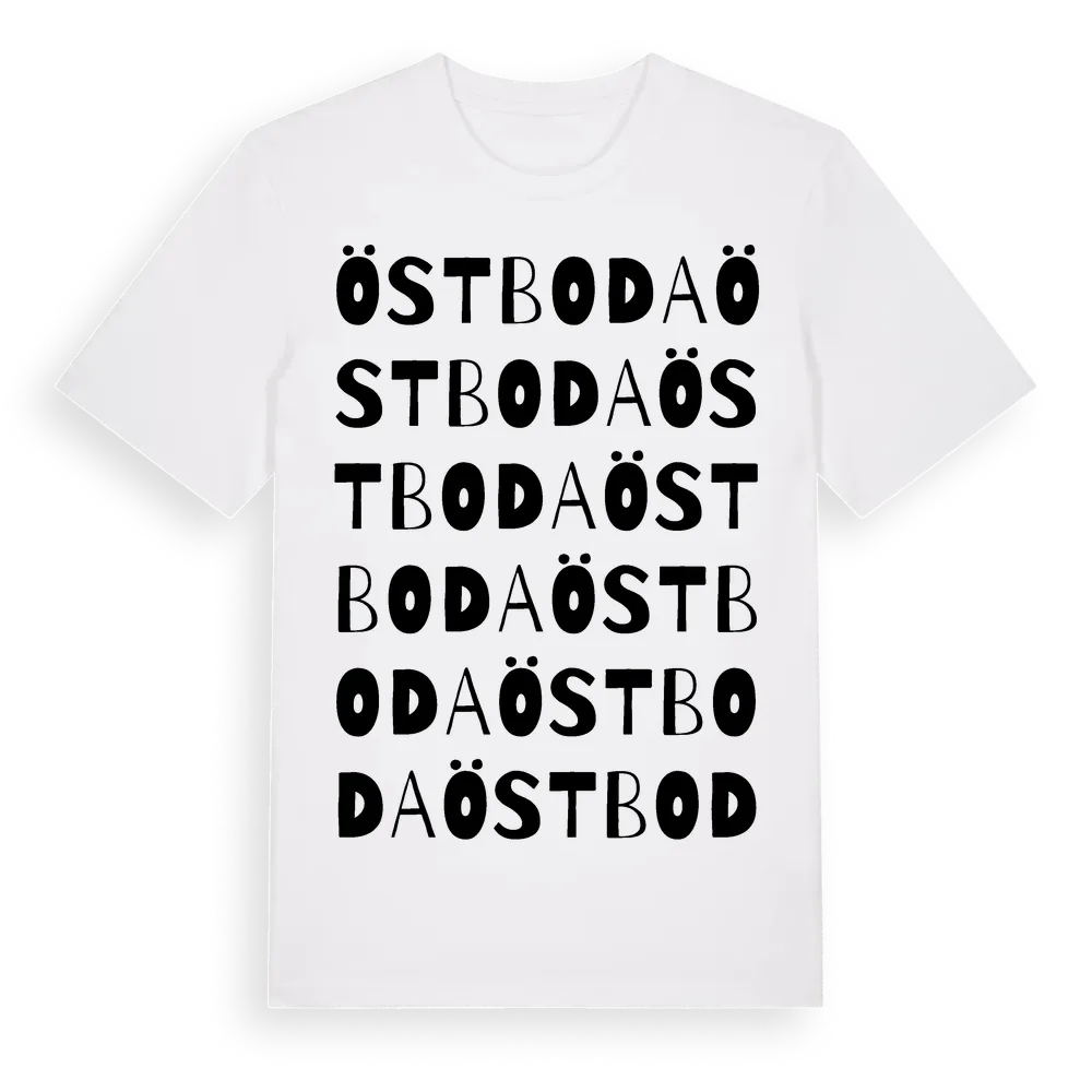 Östboda ordlek t-shirt är inspirerad av Östboda i Jämtlands län, Sverige. Tröjan är designad för dig som har en speciell koppling till platsen – oavsett om du bor här, har rötterna här eller bara älskar Östboda.