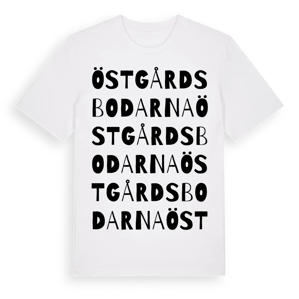 Östgårdsbodarna ordlek t-shirt är inspirerad av Östgårdsbodarna i Jämtlands län, Sverige. Tröjan är designad för dig som har en speciell koppling till platsen – oavsett om du bor här, har rötterna här eller bara älskar Östgårdsbodarna.