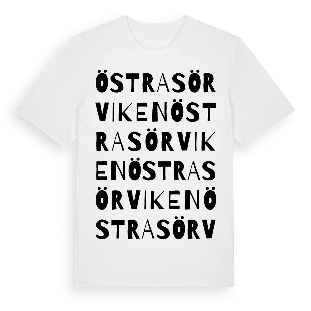 Östra Sörviken ordlek t-shirt är inspirerad av Östra Sörviken i Jämtlands län, Sverige. Tröjan är designad för dig som har en speciell koppling till platsen – oavsett om du bor här, har rötterna här eller bara älskar Östra Sörviken.