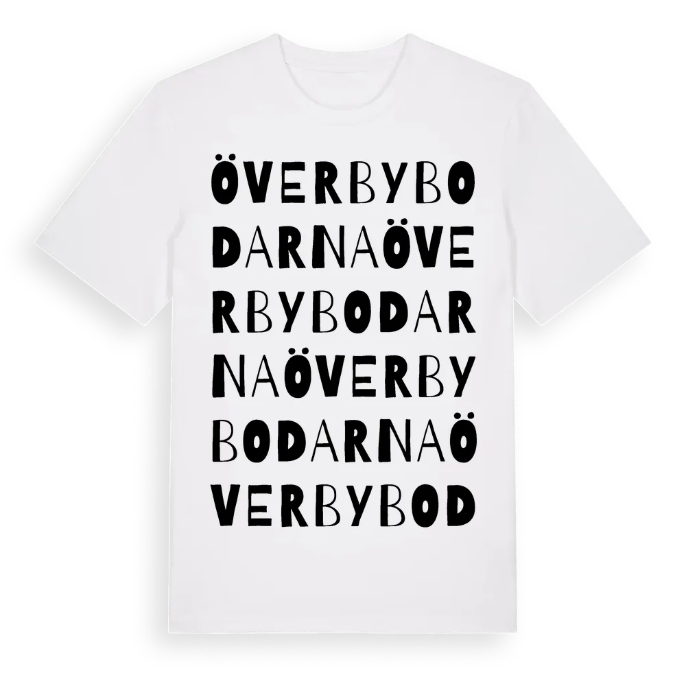 Överbybodarna ordlek t-shirt är inspirerad av Överbybodarna i Jämtlands län, Sverige. Tröjan är designad för dig som har en speciell koppling till platsen – oavsett om du bor här, har rötterna här eller bara älskar Överbybodarna.