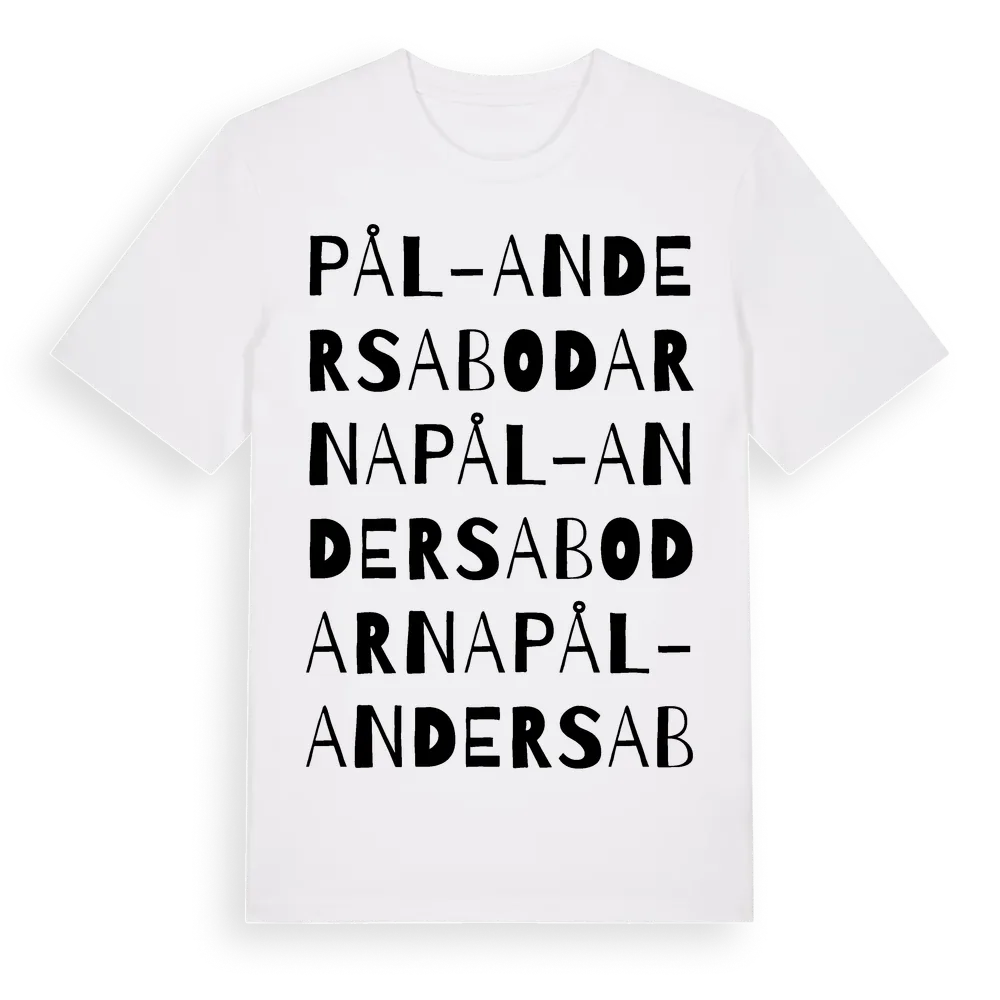 Pål-Andersabodarna ordlek t-shirt är inspirerad av Pål-Andersabodarna i Jämtlands län, Sverige. Tröjan är designad för dig som har en speciell koppling till platsen – oavsett om du bor här, har rötterna här eller bara älskar Pål-Andersabodarna.