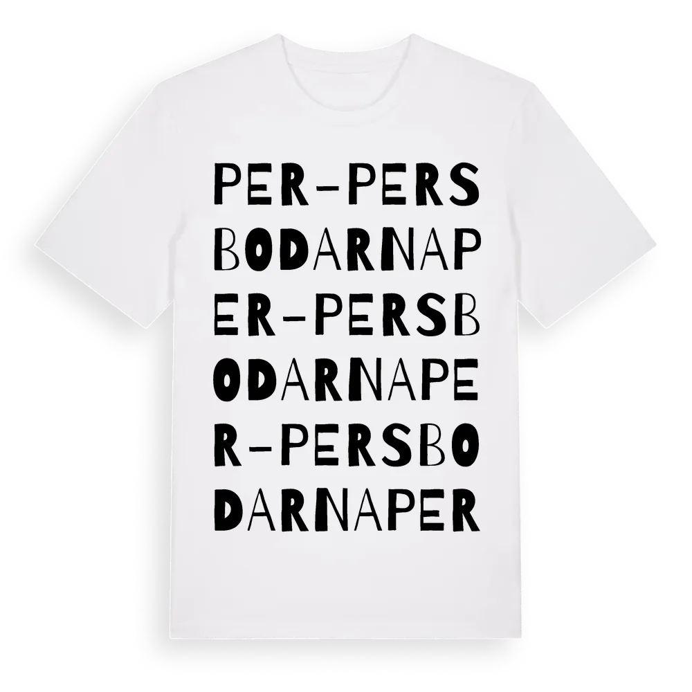 Per-Persbodarna ordlek t-shirt är inspirerad av Per-Persbodarna i Jämtlands län, Sverige. Tröjan är designad för dig som har en speciell koppling till platsen – oavsett om du bor här, har rötterna här eller bara älskar Per-Persbodarna.