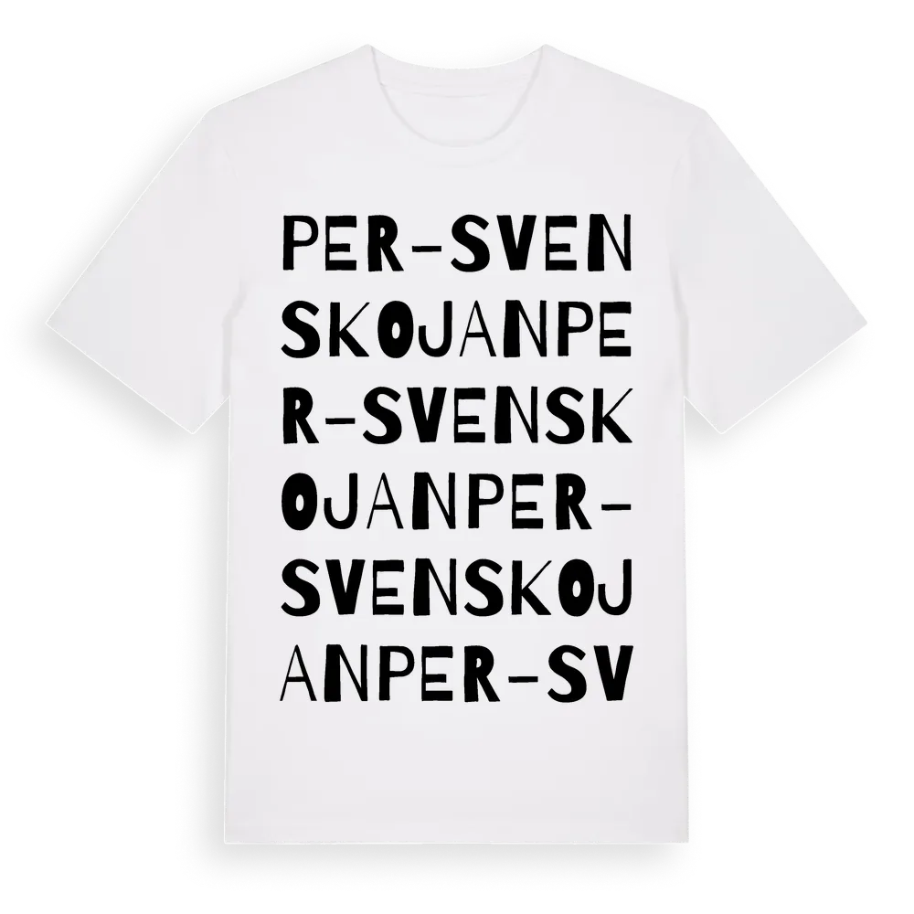 Per-Svenskojan ordlek t-shirt är inspirerad av Per-Svenskojan i Jämtlands län, Sverige. Tröjan är designad för dig som har en speciell koppling till platsen – oavsett om du bor här, har rötterna här eller bara älskar Per-Svenskojan.