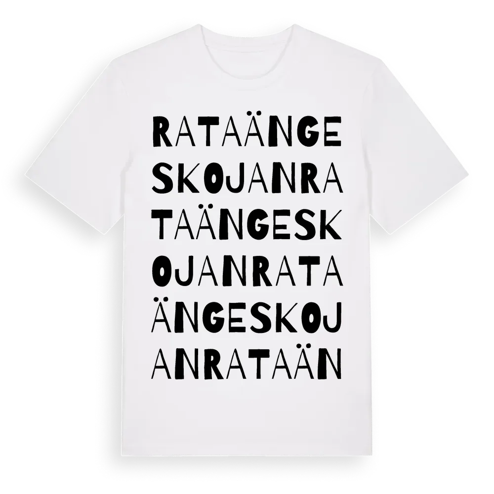 Rataängeskojan ordlek t-shirt är inspirerad av Rataängeskojan i Jämtlands län, Sverige. Tröjan är designad för dig som har en speciell koppling till platsen – oavsett om du bor här, har rötterna här eller bara älskar Rataängeskojan.