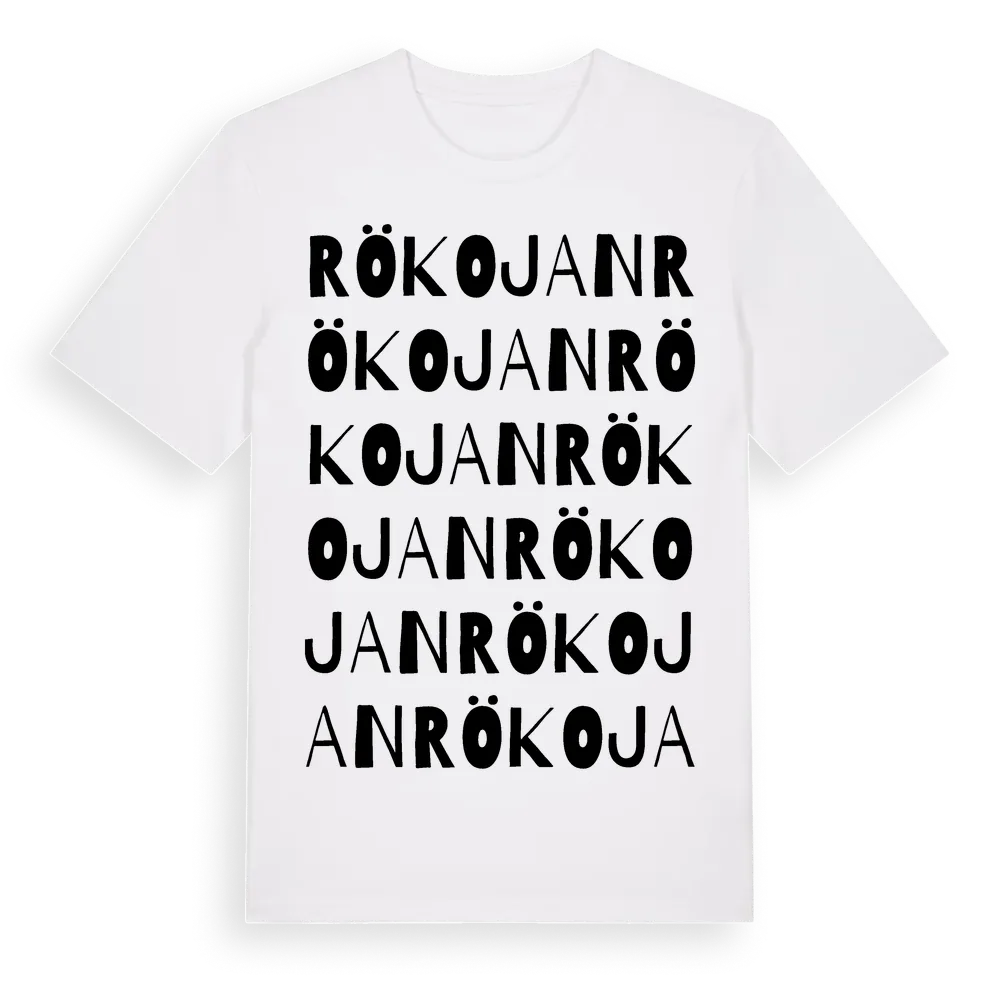 Rökojan ordlek t-shirt är inspirerad av Rökojan i Jämtlands län, Sverige. Tröjan är designad för dig som har en speciell koppling till platsen – oavsett om du bor här, har rötterna här eller bara älskar Rökojan.