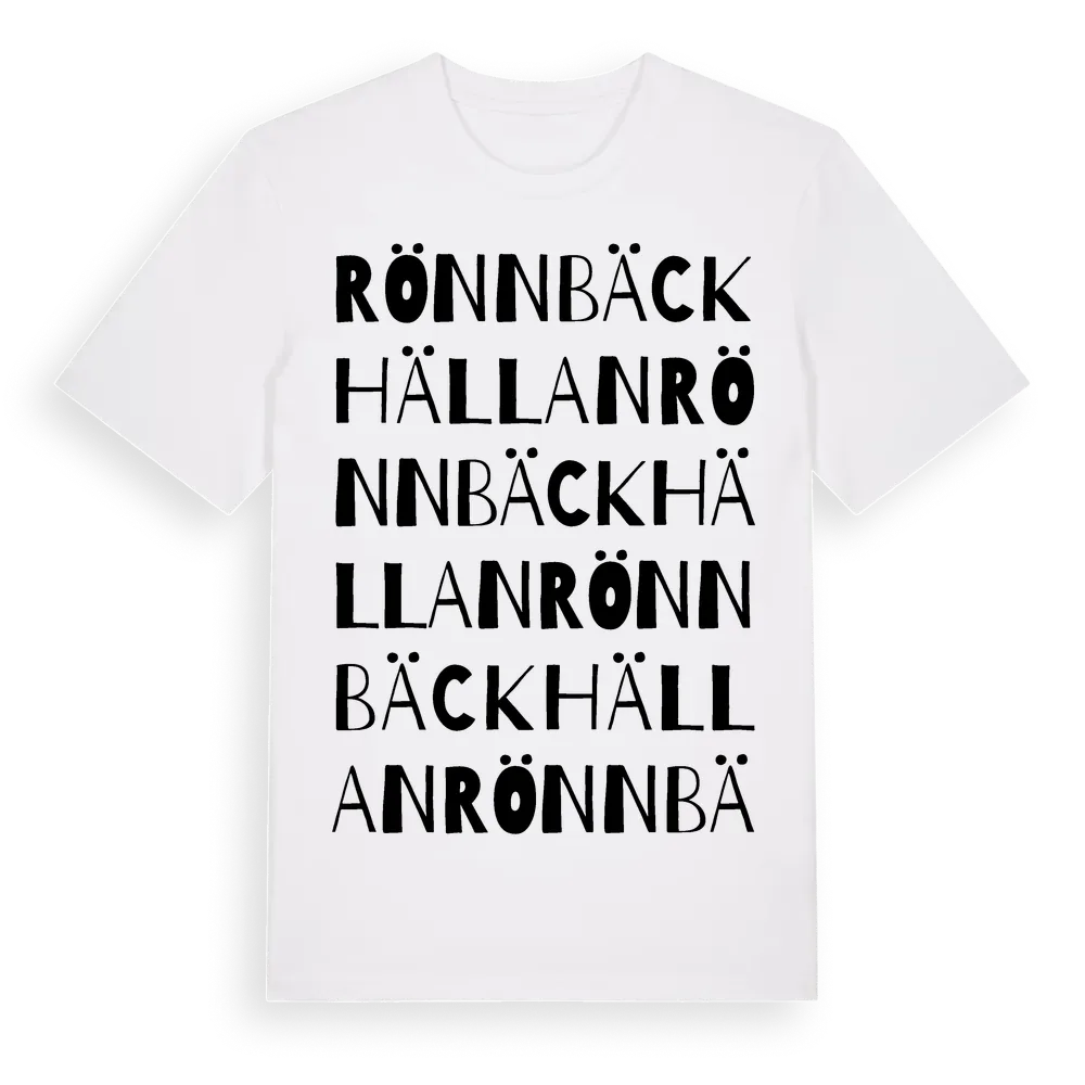 Rönnbäckhällan ordlek t-shirt är inspirerad av Rönnbäckhällan i Jämtlands län, Sverige. Tröjan är designad för dig som har en speciell koppling till platsen – oavsett om du bor här, har rötterna här eller bara älskar Rönnbäckhällan.