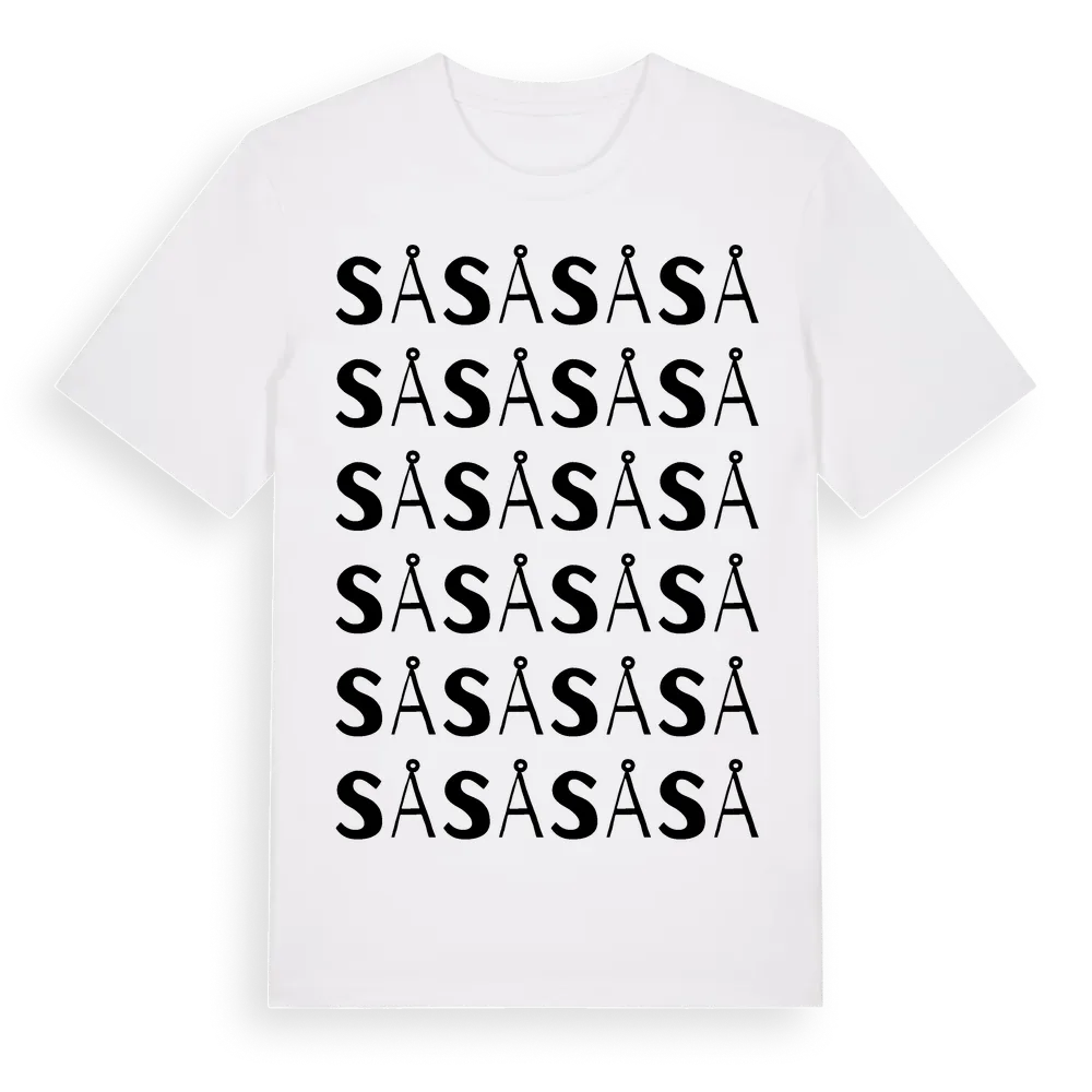En ordlek byggd på Sås namn. Subtilt och klurig – ett motiv som bara de som verkligen känner platsen fullt ut förstår. Premium bomull, unisex – från byn Så i Jämtlands län.