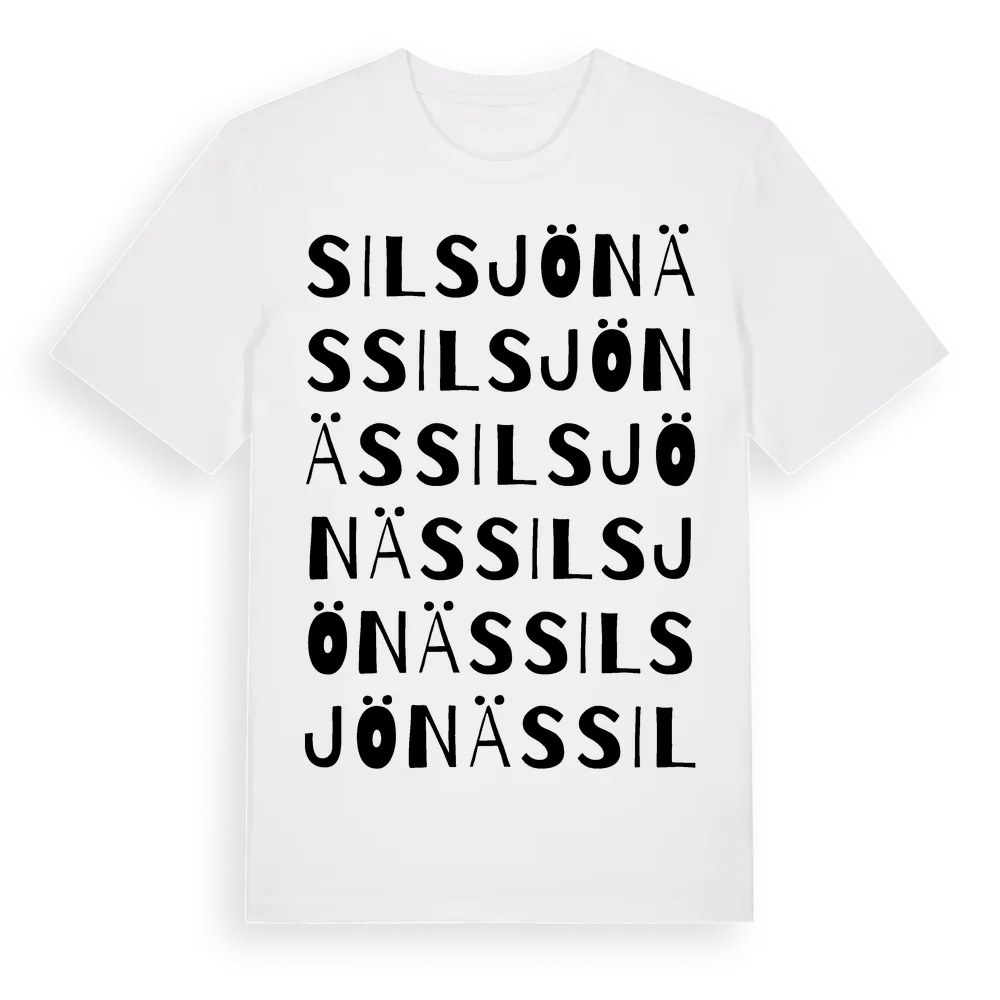 Silsjönäs ordlek t-shirt är inspirerad av byn Silsjönäs i Jämtlands län, Sverige. Tröjan är designad för dig som har en speciell koppling till platsen – oavsett om du bor här, har rötterna här eller bara älskar Silsjönäs.