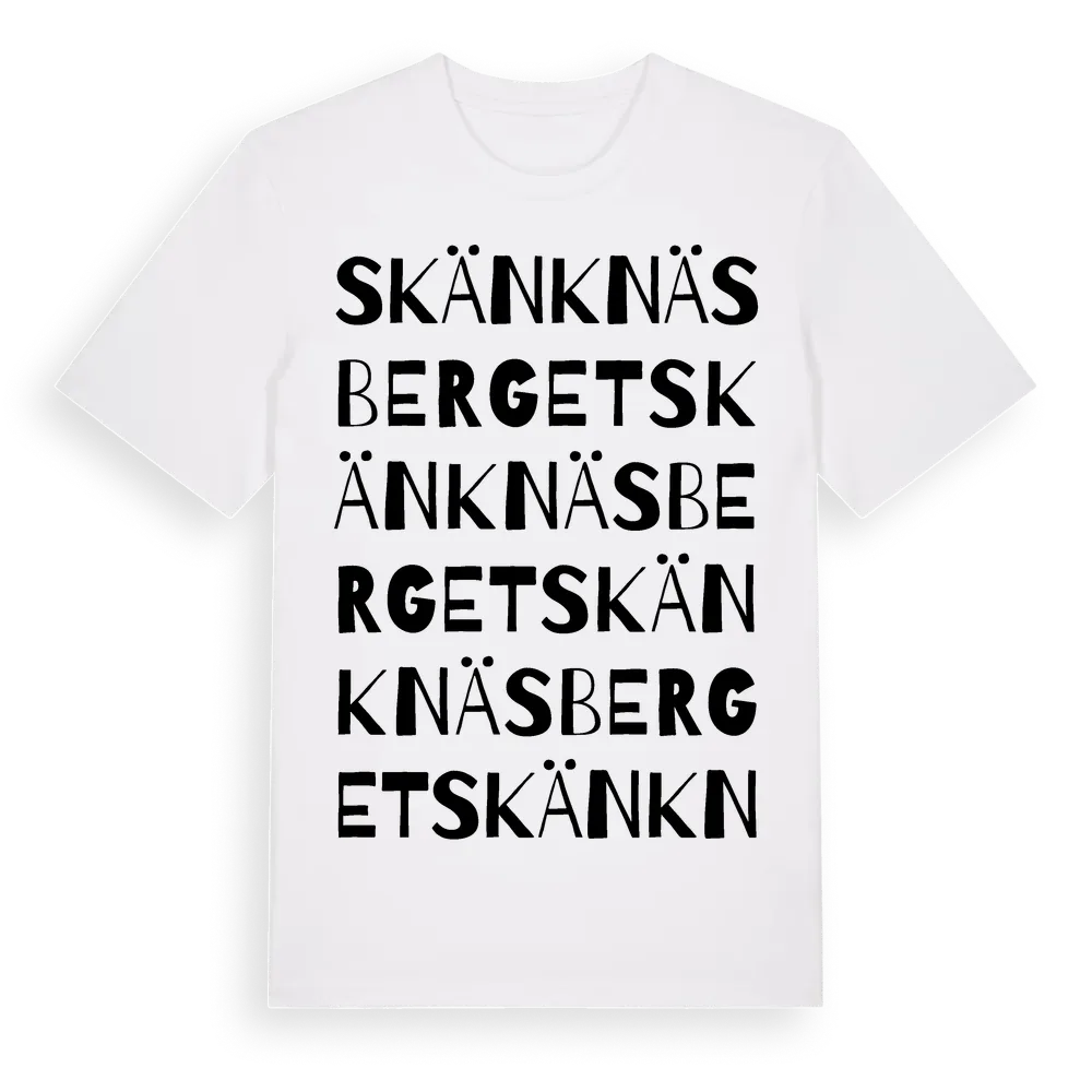 Skänknäsberget ordlek t-shirt är inspirerad av byn Skänknäsberget i Jämtlands län, Sverige. Tröjan är designad för dig som har en speciell koppling till platsen – oavsett om du bor här, har rötterna här eller bara älskar Skänknäsberget.