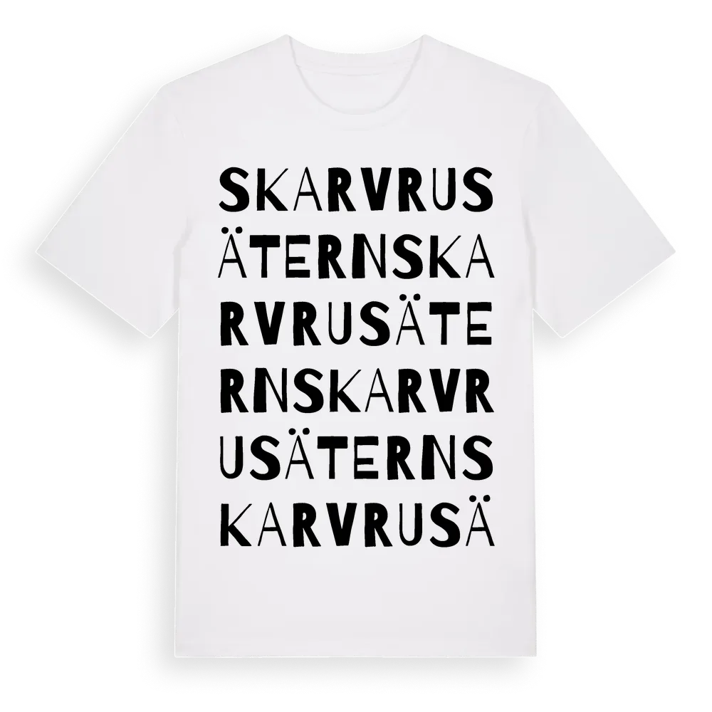 Skarvrusätern ordlek t-shirt är inspirerad av byn Skarvrusätern i Jämtlands län, Sverige. Tröjan är designad för dig som har en speciell koppling till platsen – oavsett om du bor här, har rötterna här eller bara älskar Skarvrusätern.