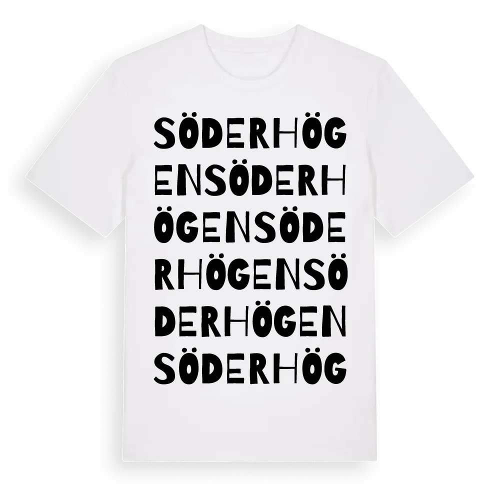 Söderhögen ordlek t-shirt är inspirerad av byn Söderhögen i Jämtlands län, Sverige. Tröjan är designad för dig som har en speciell koppling till platsen – oavsett om du bor här, har rötterna här eller bara älskar Söderhögen.