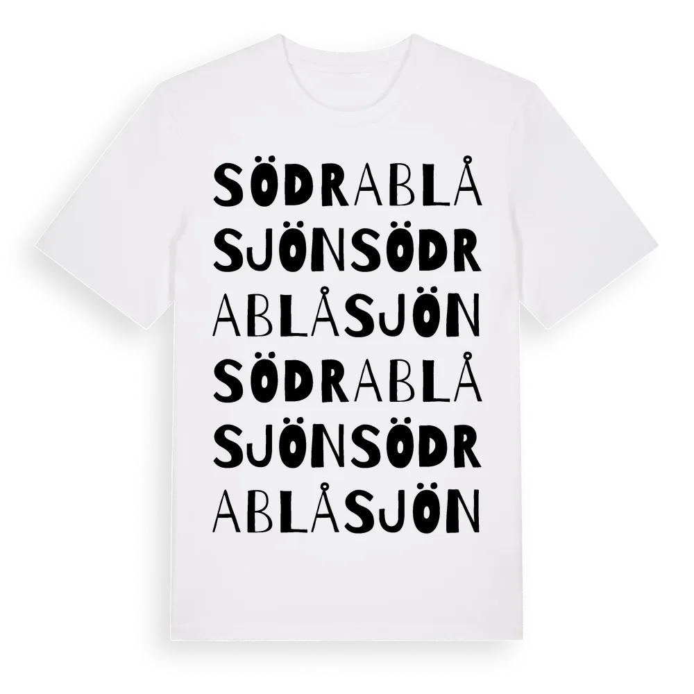 Södra Blåsjön ordlek t-shirt är inspirerad av byn Södra Blåsjön i Jämtlands län, Sverige. Tröjan är designad för dig som har en speciell koppling till platsen – oavsett om du bor här, har rötterna här eller bara älskar Södra Blåsjön.