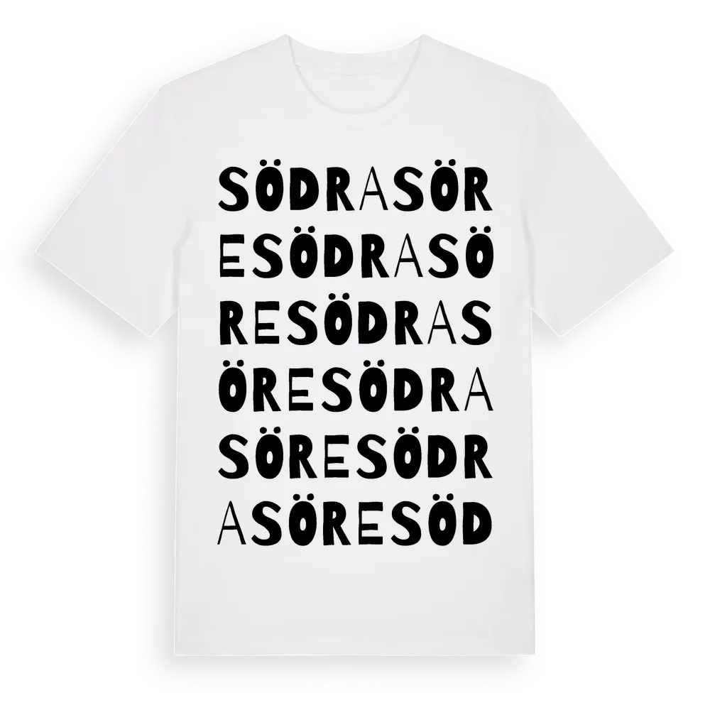 Södra Söre ordlek t-shirt är inspirerad av byn Södra Söre i Jämtlands län, Sverige. Tröjan är designad för dig som har en speciell koppling till platsen – oavsett om du bor här, har rötterna här eller bara älskar Södra Söre.