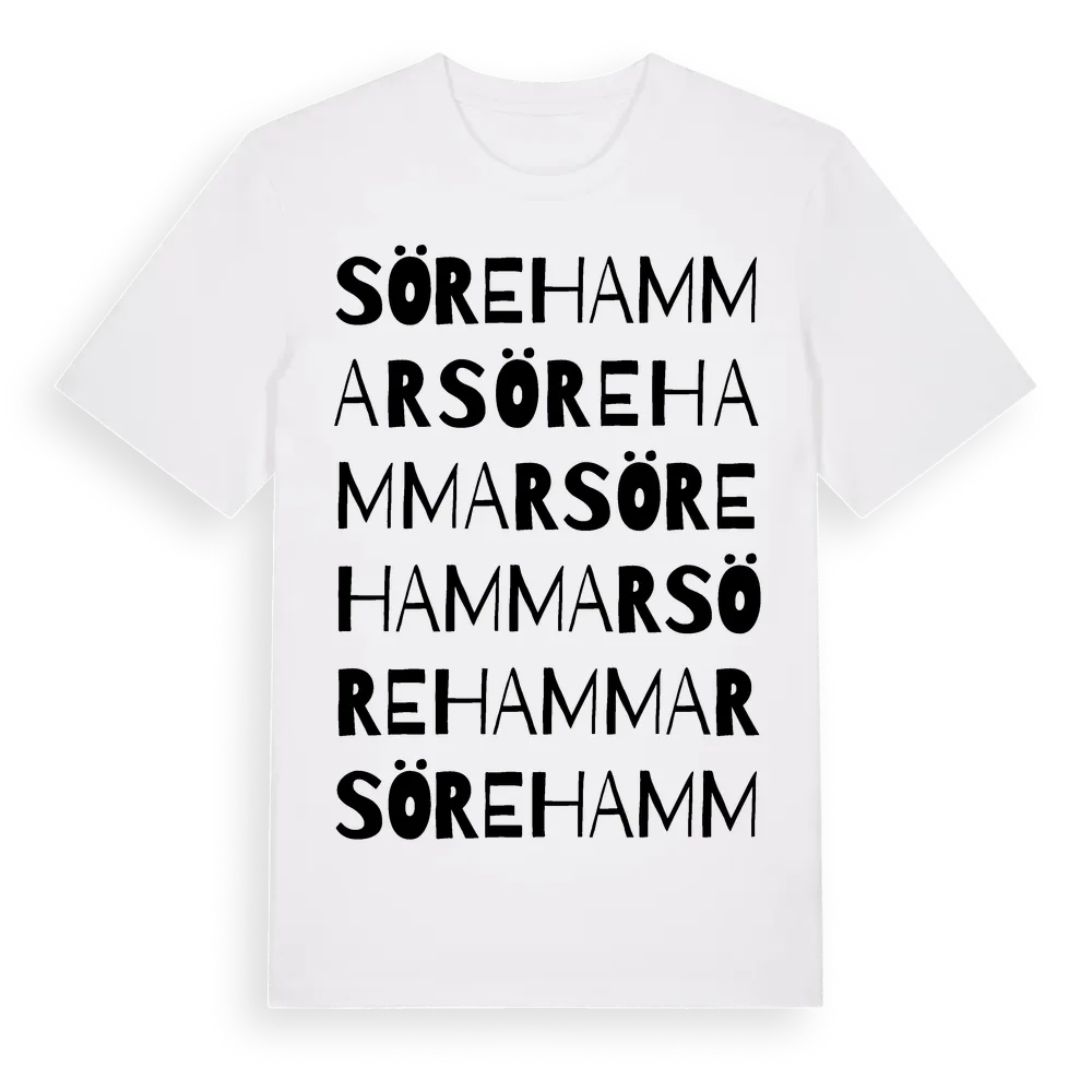 Sörehammar ordlek t-shirt är inspirerad av Sörehammar i Jämtlands län, Sverige. Tröjan är designad för dig som har en speciell koppling till platsen – oavsett om du bor här, har rötterna här eller bara älskar Sörehammar.