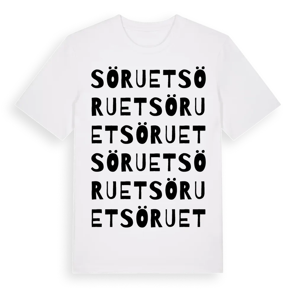 Söruet ordlek t-shirt är inspirerad av Söruet i Jämtlands län, Sverige. Tröjan är designad för dig som har en speciell koppling till platsen – oavsett om du bor här, har rötterna här eller bara älskar Söruet.