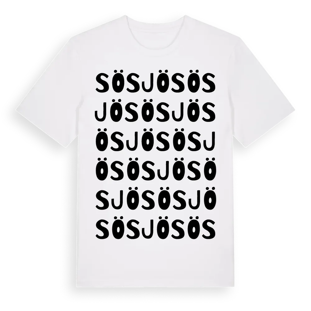 Sösjö ordlek t-shirt är inspirerad av byn Sösjö i Jämtlands län, Sverige. Tröjan är designad för dig som har en speciell koppling till platsen – oavsett om du bor här, har rötterna här eller bara älskar Sösjö.