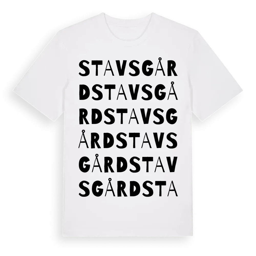 Stavsgård ordlek t-shirt är inspirerad av byn Stavsgård i Jämtlands län, Sverige. Tröjan är designad för dig som har en speciell koppling till platsen – oavsett om du bor här, har rötterna här eller bara älskar Stavsgård.