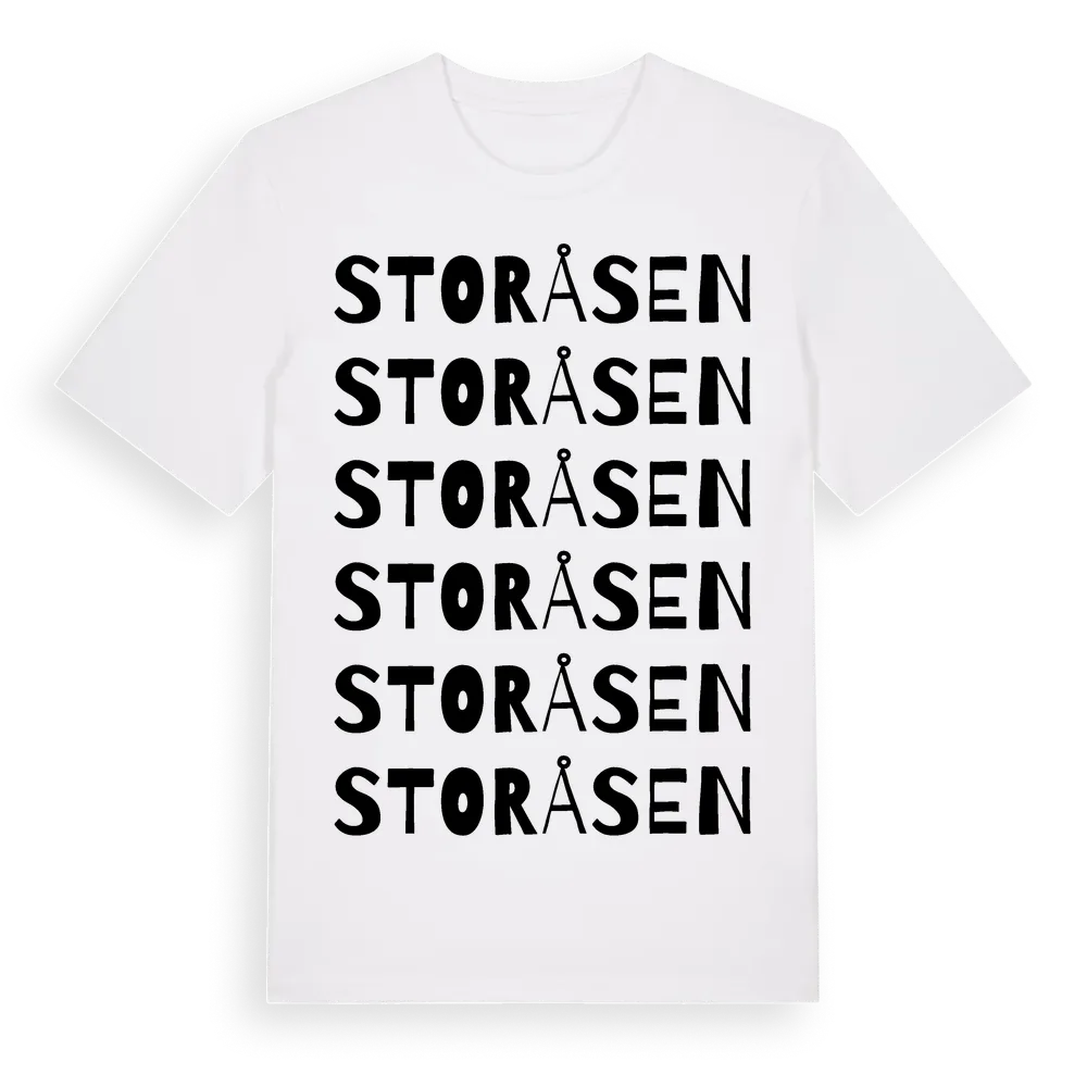 Storåsen ordlek t-shirt är inspirerad av byn Storåsen i Jämtlands län, Sverige. Tröjan är designad för dig som har en speciell koppling till platsen – oavsett om du bor här, har rötterna här eller bara älskar Storåsen.