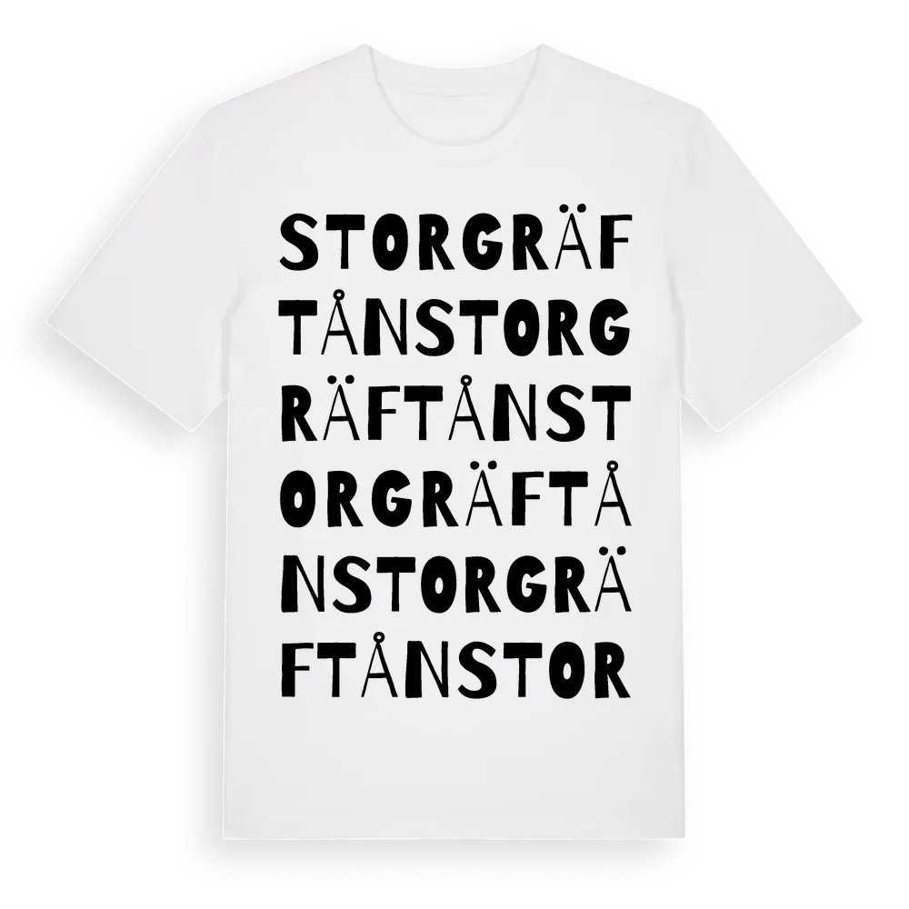 Storgräftån ordlek t-shirt är inspirerad av byn Storgräftån i Jämtlands län, Sverige. Tröjan är designad för dig som har en speciell koppling till platsen – oavsett om du bor här, har rötterna här eller bara älskar Storgräftån.