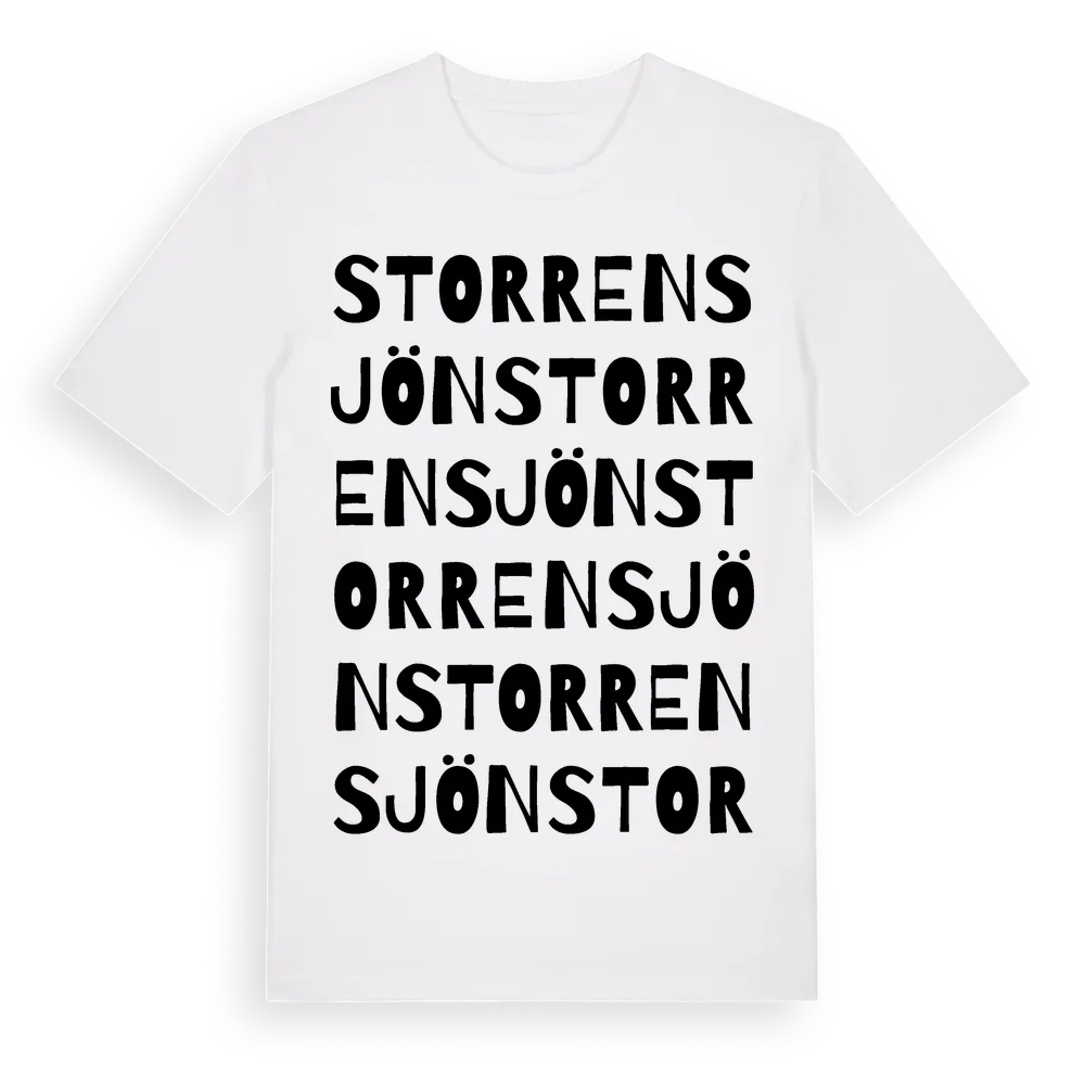 Storrensjön ordlek t-shirt är inspirerad av Storrensjön i Jämtlands län, Sverige. Tröjan är designad för dig som har en speciell koppling till platsen – oavsett om du bor här, har rötterna här eller bara älskar Storrensjön.
