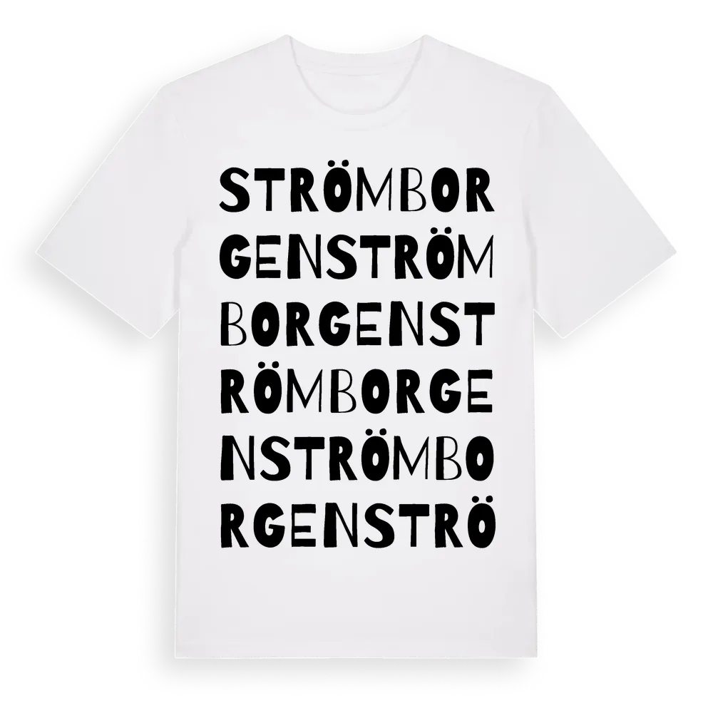 Strömborgen ordlek t-shirt är inspirerad av Strömborgen i Jämtlands län, Sverige. Tröjan är designad för dig som har en speciell koppling till platsen – oavsett om du bor här, har rötterna här eller bara älskar Strömborgen.