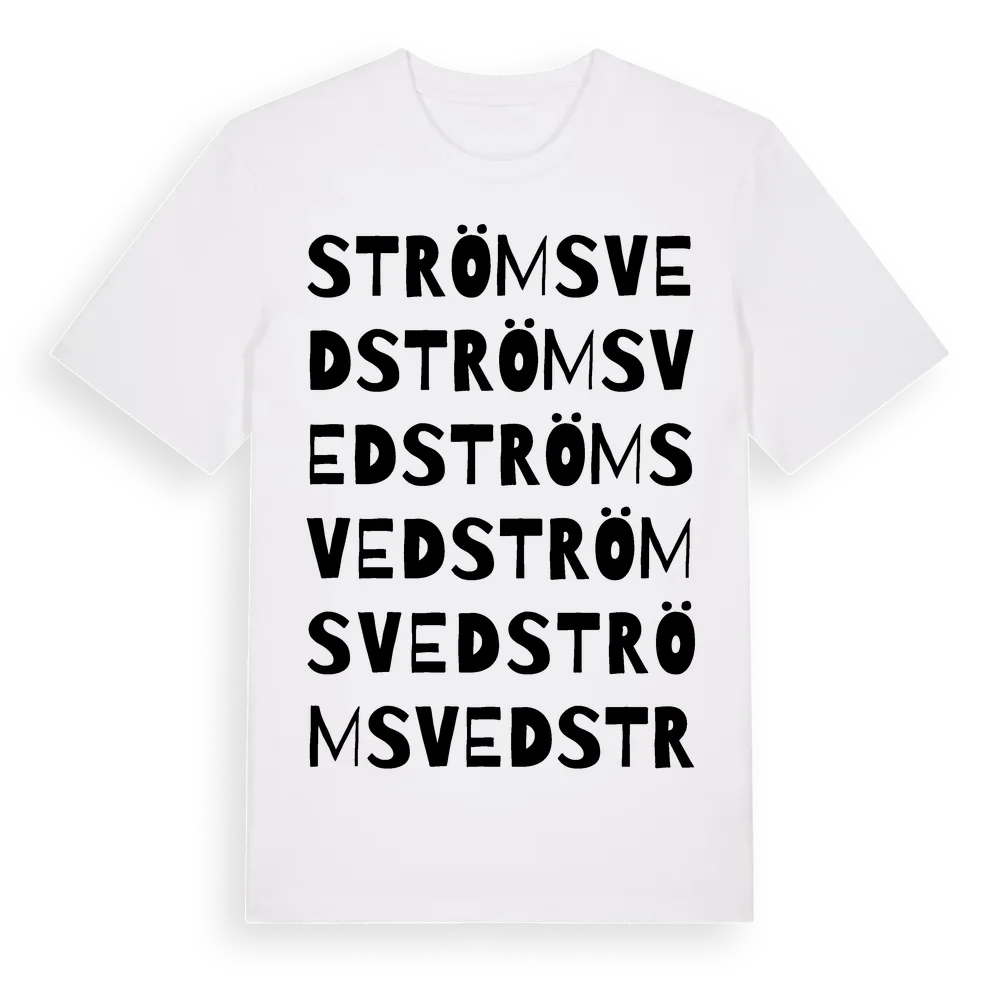 Strömsved ordlek t-shirt är inspirerad av Strömsved i Jämtlands län, Sverige. Tröjan är designad för dig som har en speciell koppling till platsen – oavsett om du bor här, har rötterna här eller bara älskar Strömsved.