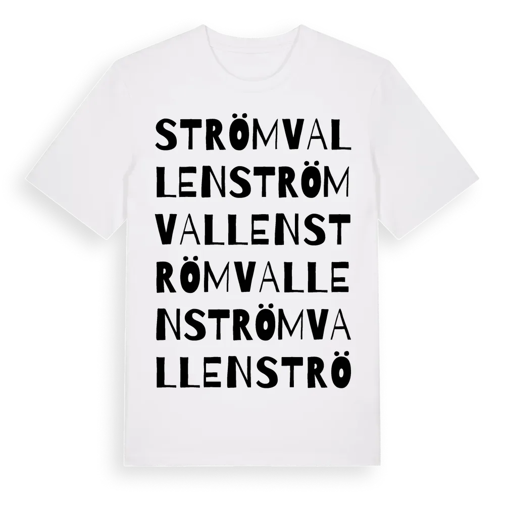 Strömvallen ordlek t-shirt är inspirerad av Strömvallen i Jämtlands län, Sverige. Tröjan är designad för dig som har en speciell koppling till platsen – oavsett om du bor här, har rötterna här eller bara älskar Strömvallen.