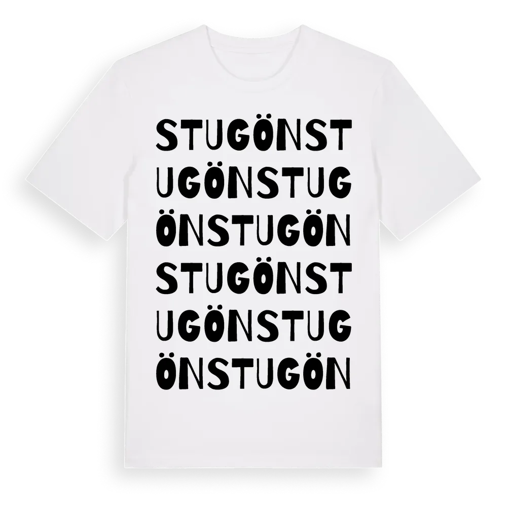 Stugön ordlek t-shirt är inspirerad av ön Stugön i Jämtlands län, Sverige. Tröjan är designad för dig som har en speciell koppling till platsen – oavsett om du bor här, har rötterna här eller bara älskar Stugön.