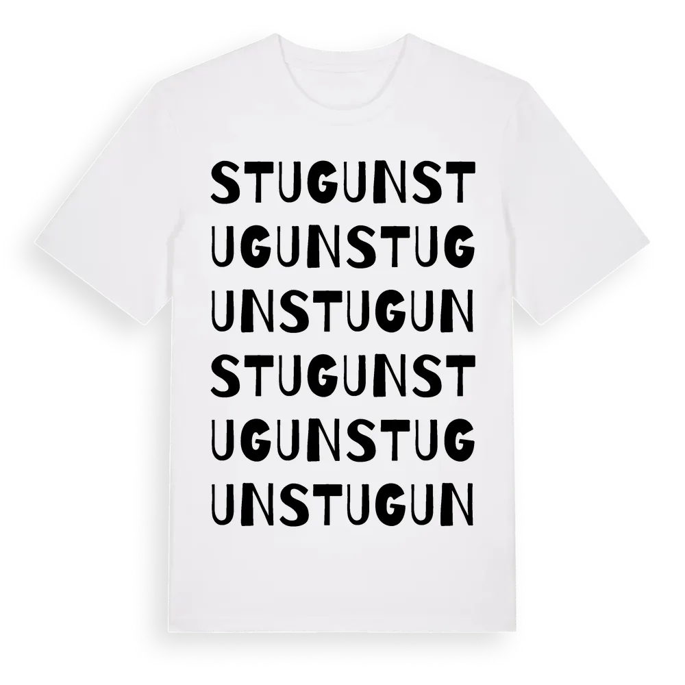 En ordlek byggd på Stuguns namn. Subtilt och klurig – ett motiv som bara de som verkligen känner platsen fullt ut förstår. Premium bomull, unisex – från byn Stugun i Jämtlands län.