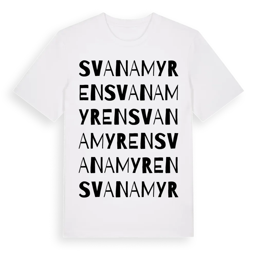 Svanamyren ordlek t-shirt är inspirerad av byn Svanamyren i Jämtlands län, Sverige. Tröjan är designad för dig som har en speciell koppling till platsen – oavsett om du bor här, har rötterna här eller bara älskar Svanamyren.