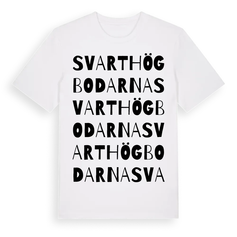 Svarthögbodarna ordlek t-shirt är inspirerad av Svarthögbodarna i Jämtlands län, Sverige. Tröjan är designad för dig som har en speciell koppling till platsen – oavsett om du bor här, har rötterna här eller bara älskar Svarthögbodarna.