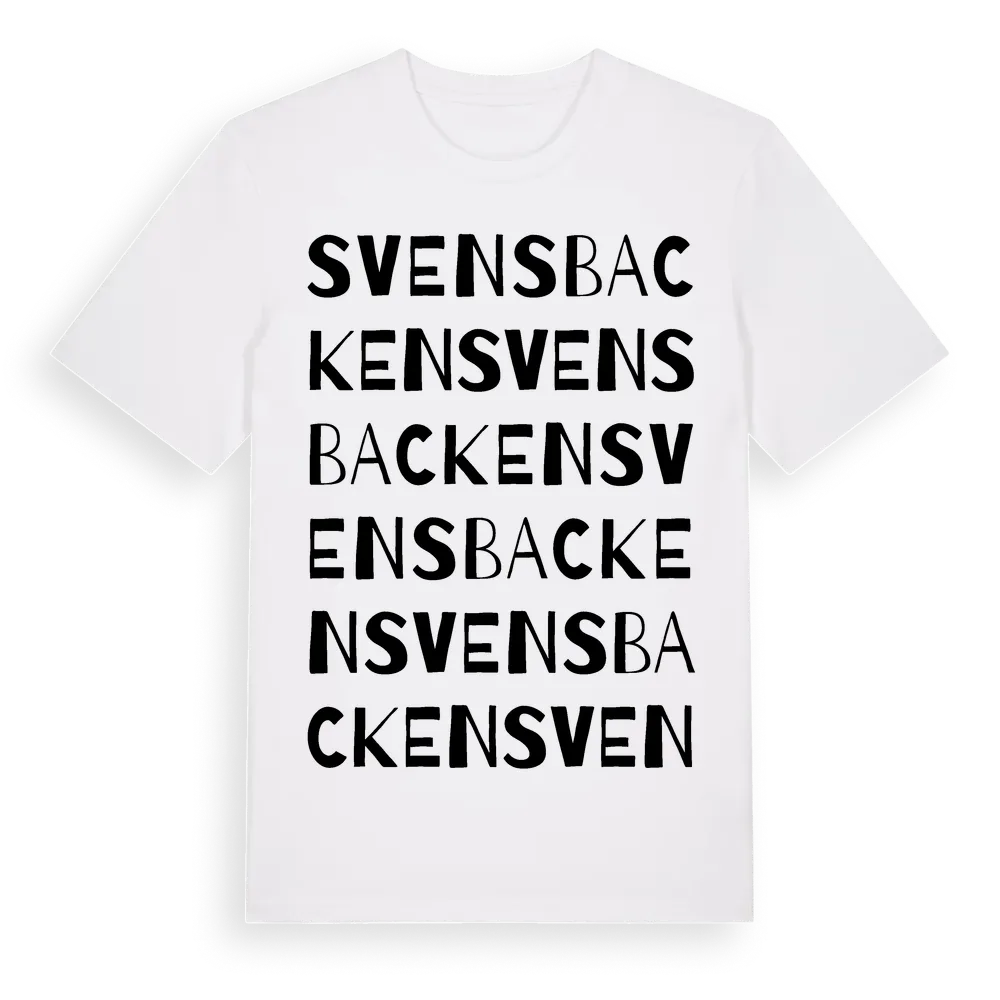 Svensbacken ordlek t-shirt är inspirerad av Svensbacken i Jämtlands län, Sverige. Tröjan är designad för dig som har en speciell koppling till platsen – oavsett om du bor här, har rötterna här eller bara älskar Svensbacken.