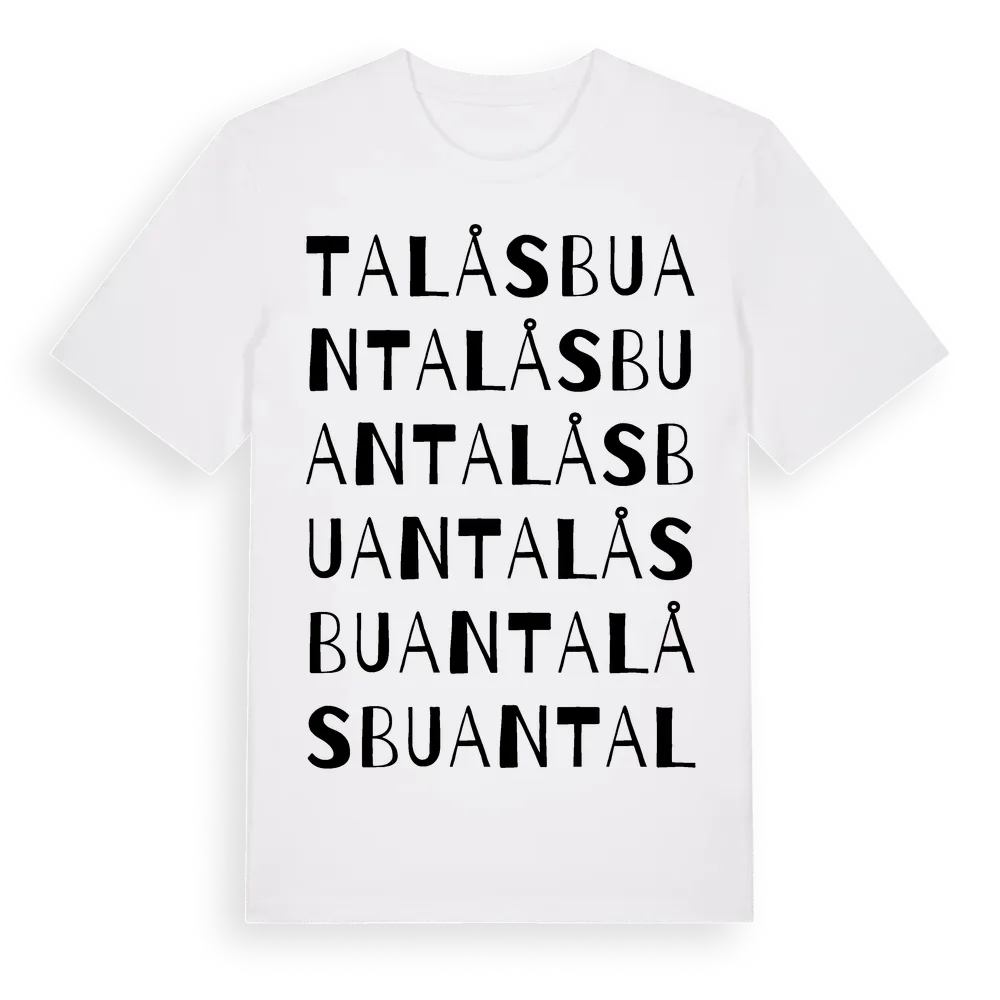Talåsbuan ordlek t-shirt är inspirerad av Talåsbuan i Jämtlands län, Sverige. Tröjan är designad för dig som har en speciell koppling till platsen – oavsett om du bor här, har rötterna här eller bara älskar Talåsbuan.