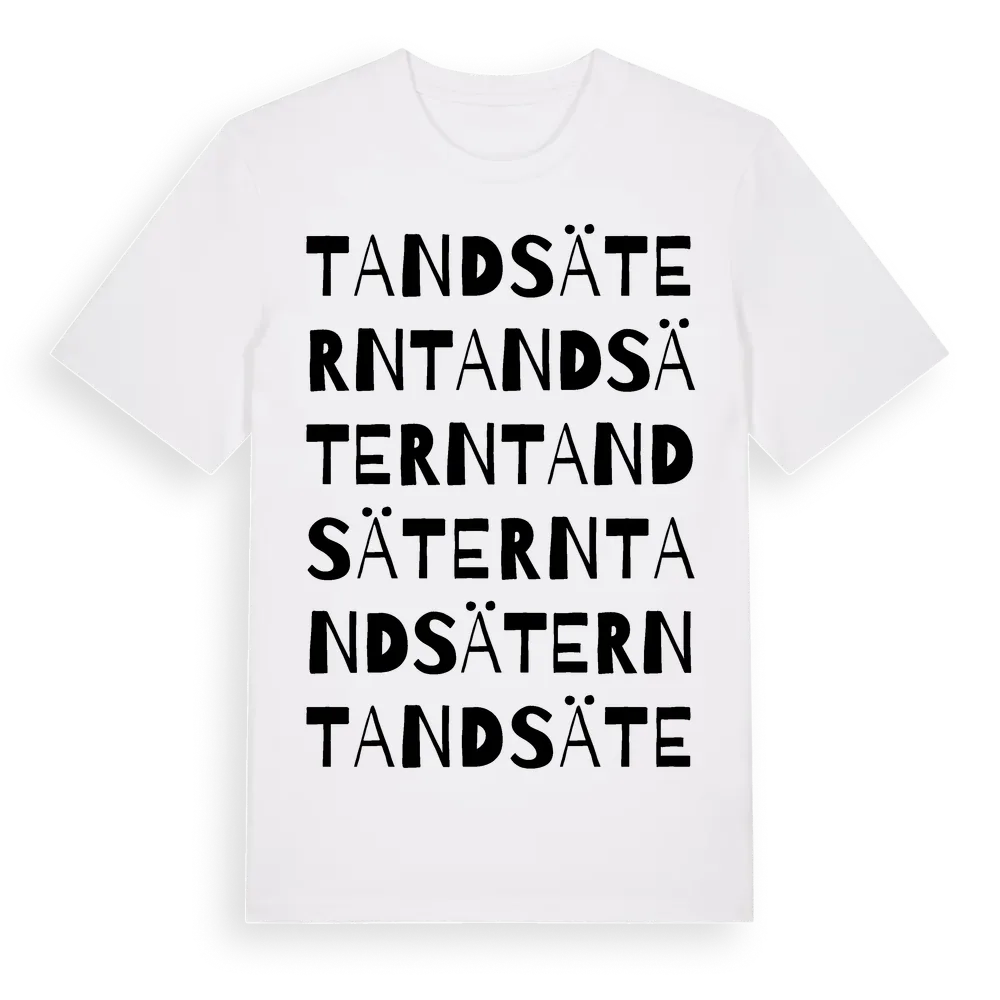 En ordlek byggd på Tandsäterns namn. Subtilt och klurig – ett motiv som bara de som verkligen känner platsen fullt ut förstår. Premium bomull, unisex – från Tandsätern i Jämtlands län.