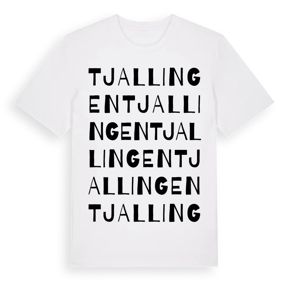 Tjallingen ordlek t-shirt är inspirerad av Tjallingen i Jämtlands län, Sverige. Tröjan är designad för dig som har en speciell koppling till platsen – oavsett om du bor här, har rötterna här eller bara älskar Tjallingen.