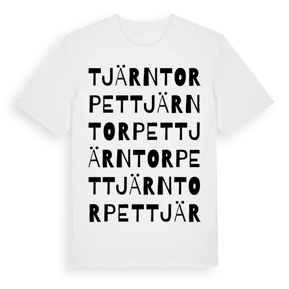 Tjärntorpet ordlek t-shirt är inspirerad av Tjärntorpet i Jämtlands län, Sverige. Tröjan är designad för dig som har en speciell koppling till platsen – oavsett om du bor här, har rötterna här eller bara älskar Tjärntorpet.