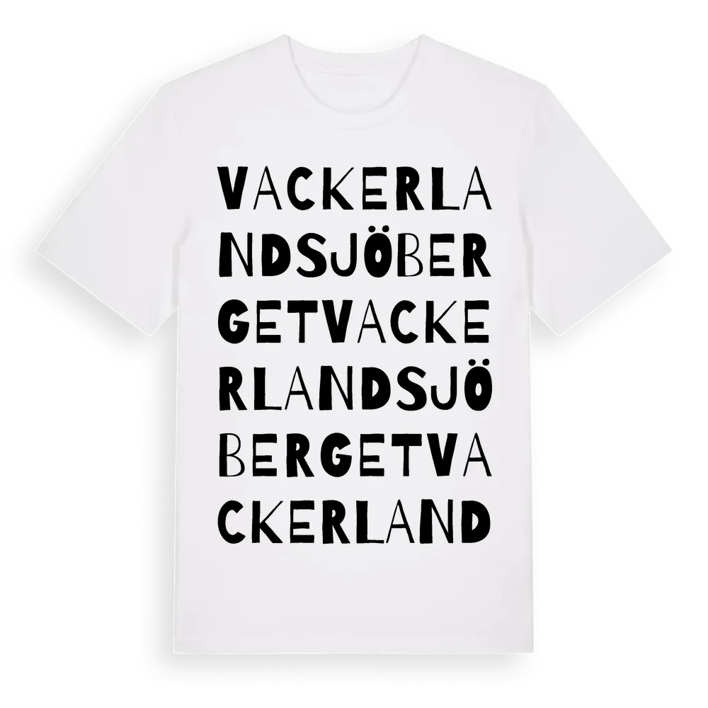 Vackerlandsjöberget ordlek t-shirt är inspirerad av Vackerlandsjöberget i Jämtlands län, Sverige. Tröjan är designad för dig som har en speciell koppling till platsen – oavsett om du bor här, har rötterna här eller bara älskar Vackerlandsjöberget.