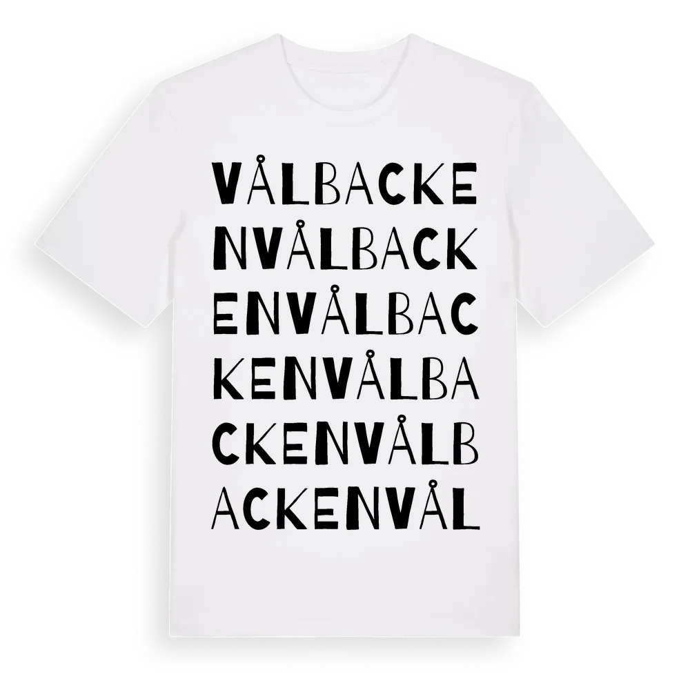Vålbacken ordlek t-shirt är inspirerad av byn Vålbacken i Jämtlands län, Sverige. Tröjan är designad för dig som har en speciell koppling till platsen – oavsett om du bor här, har rötterna här eller bara älskar Vålbacken.
