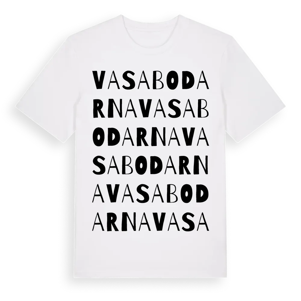 Vasabodarna ordlek t-shirt är inspirerad av Vasabodarna i Jämtlands län, Sverige. Tröjan är designad för dig som har en speciell koppling till platsen – oavsett om du bor här, har rötterna här eller bara älskar Vasabodarna.