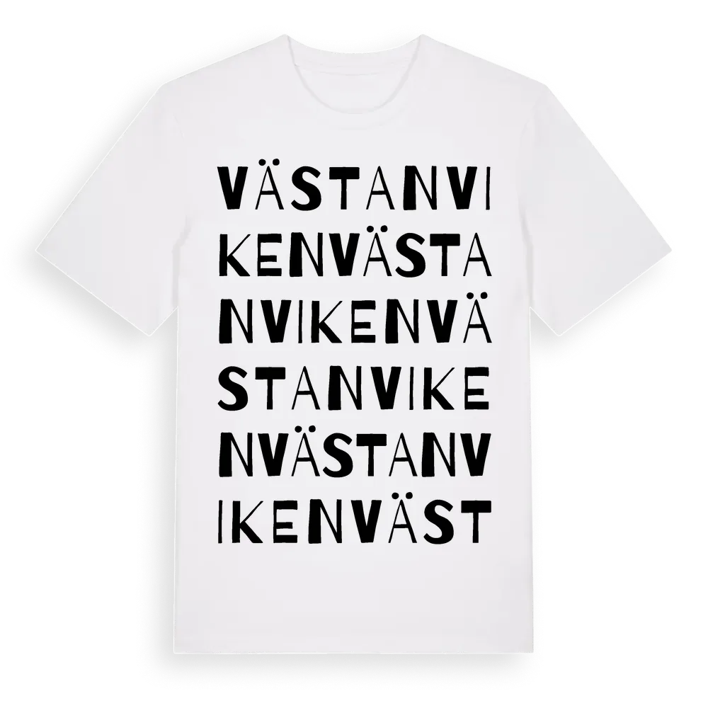 Västanviken ordlek t-shirt är inspirerad av byn Västanviken i Jämtlands län, Sverige. Tröjan är designad för dig som har en speciell koppling till platsen – oavsett om du bor här, har rötterna här eller bara älskar Västanviken.