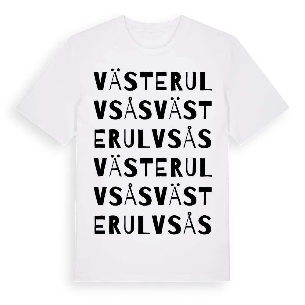 Västerulvsås ordlek t-shirt är inspirerad av byn Västerulvsås i Jämtlands län, Sverige. Tröjan är designad för dig som har en speciell koppling till platsen – oavsett om du bor här, har rötterna här eller bara älskar Västerulvsås.