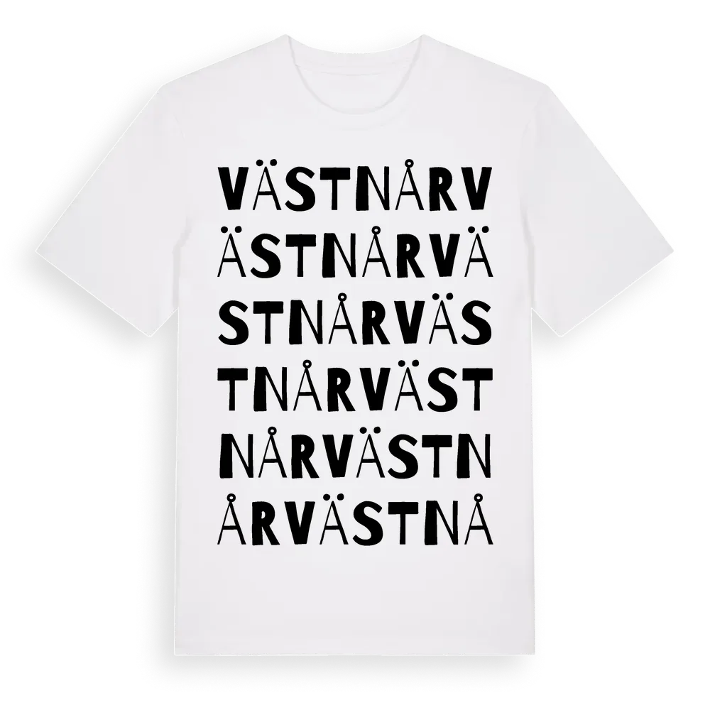 Västnår ordlek t-shirt är inspirerad av byn Västnår i Jämtlands län, Sverige. Tröjan är designad för dig som har en speciell koppling till platsen – oavsett om du bor här, har rötterna här eller bara älskar Västnår.
