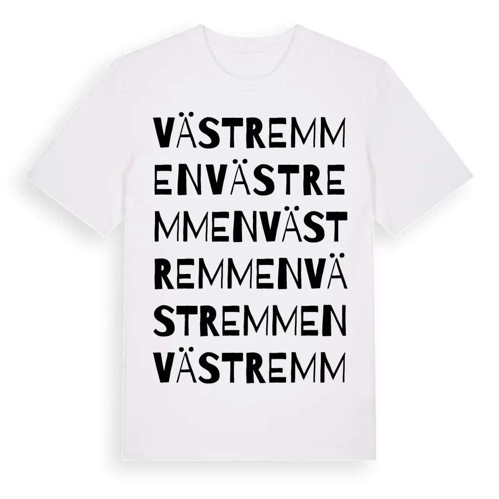 Västremmen ordlek t-shirt är inspirerad av Västremmen i Jämtlands län, Sverige. Tröjan är designad för dig som har en speciell koppling till platsen – oavsett om du bor här, har rötterna här eller bara älskar Västremmen.