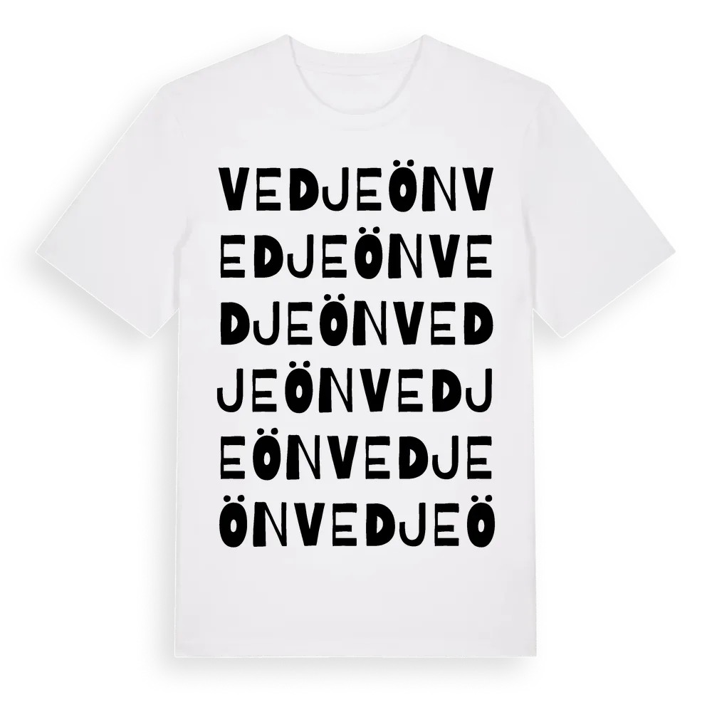 Vedjeön ordlek t-shirt är inspirerad av byn Vedjeön i Jämtlands län, Sverige. Tröjan är designad för dig som har en speciell koppling till platsen – oavsett om du bor här, har rötterna här eller bara älskar Vedjeön.