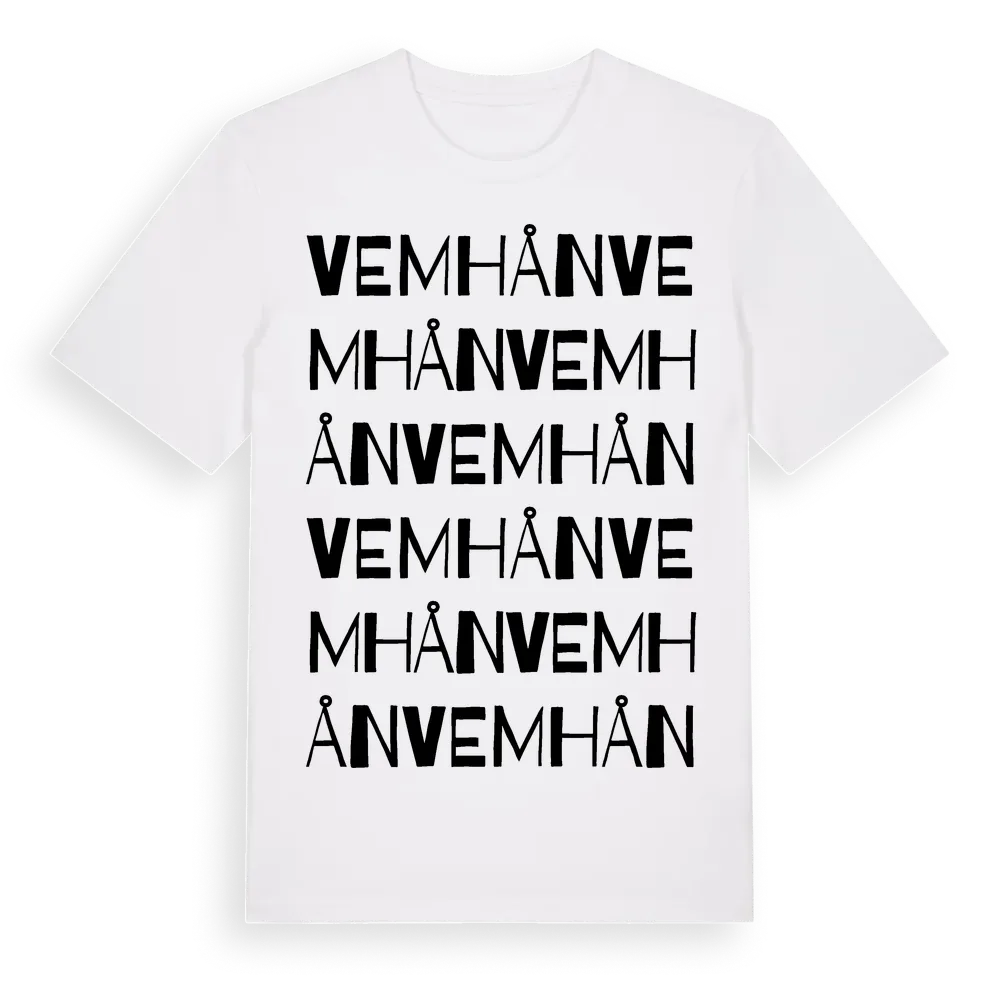 Vemhån ordlek t-shirt är inspirerad av byn Vemhån i Jämtlands län, Sverige. Tröjan är designad för dig som har en speciell koppling till platsen – oavsett om du bor här, har rötterna här eller bara älskar Vemhån.