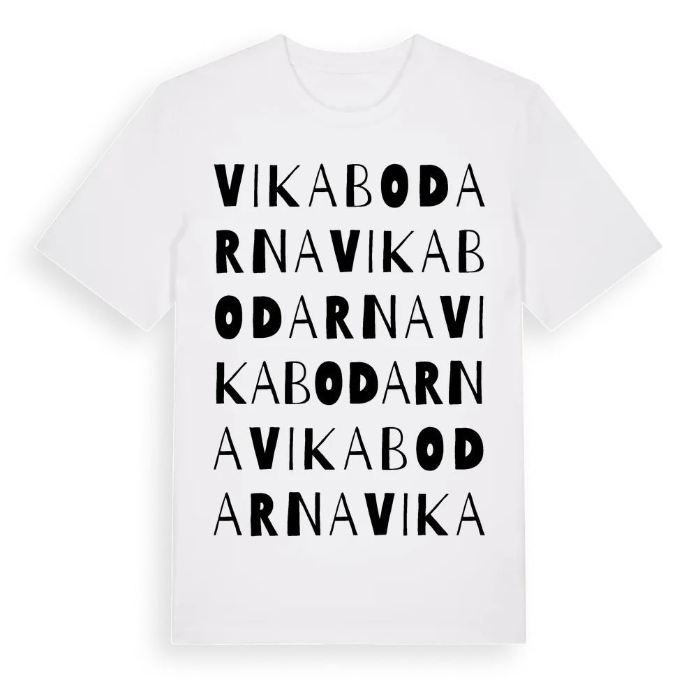 Vikabodarna ordlek t-shirt är inspirerad av Vikabodarna i Jämtlands län, Sverige. Tröjan är designad för dig som har en speciell koppling till platsen – oavsett om du bor här, har rötterna här eller bara älskar Vikabodarna.