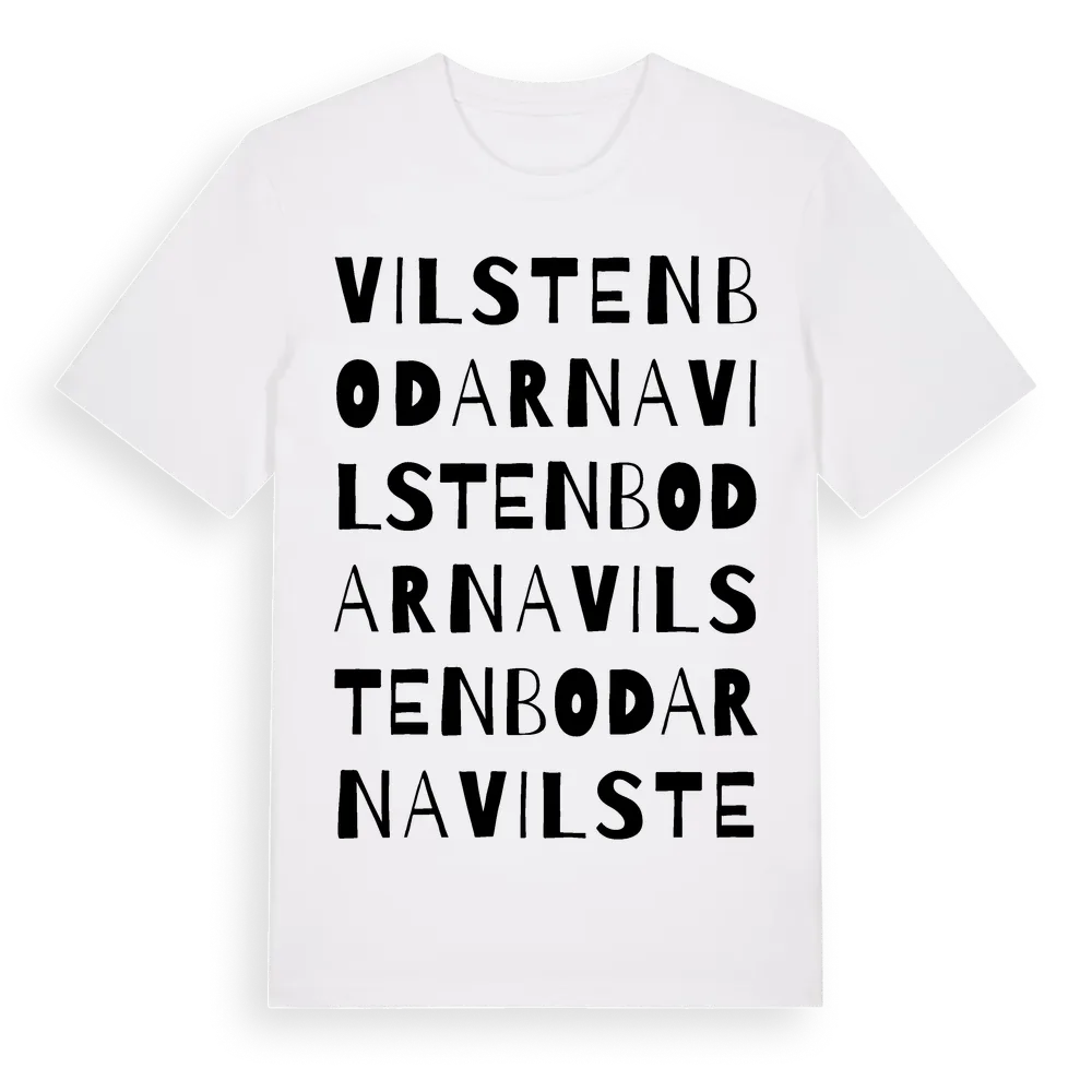 Vilstenbodarna ordlek t-shirt är inspirerad av Vilstenbodarna i Jämtlands län, Sverige. Tröjan är designad för dig som har en speciell koppling till platsen – oavsett om du bor här, har rötterna här eller bara älskar Vilstenbodarna.