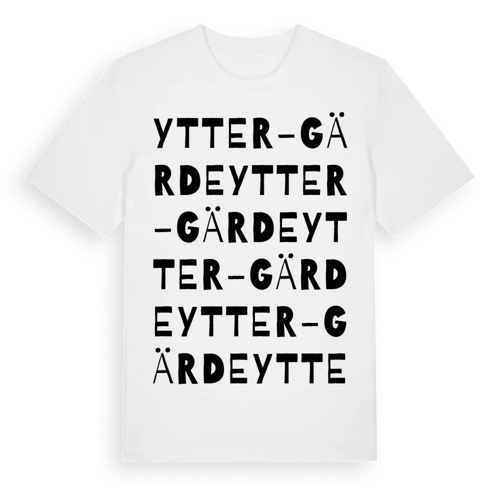 Ytter-Gärde ordlek t-shirt är inspirerad av byn Ytter-Gärde i Jämtlands län, Sverige. Tröjan är designad för dig som har en speciell koppling till platsen – oavsett om du bor här, har rötterna här eller bara älskar Ytter-Gärde.