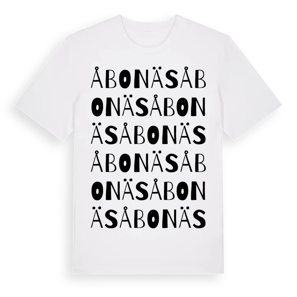 Åbonäs ordlek t-shirt är inspirerad av Åbonäs i Jönköpings län, Sverige. Tröjan är designad för dig som har en speciell koppling till platsen – oavsett om du bor här, har rötterna här eller bara älskar Åbonäs.